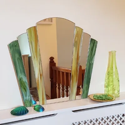 This beautiful green Art Deco fan mirror has been hand crafted by the traditional Tiffany method using genuine high quality green stained glass, copper foil and solder.