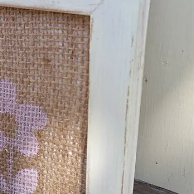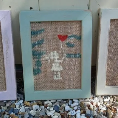 A beautiful 3 set of Childrens famed prints..Handmade from reclaimed frames ,we remove all glass , sand and make new backboards from reclaimed woods ..Old coffee hessian bags are stuck and used as background..Hand blocked girl with balloon ,dog,and flower are added.Cottage cream ,pink and sage vintage finish frames ..Hanging rope on rear..