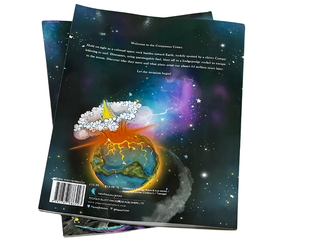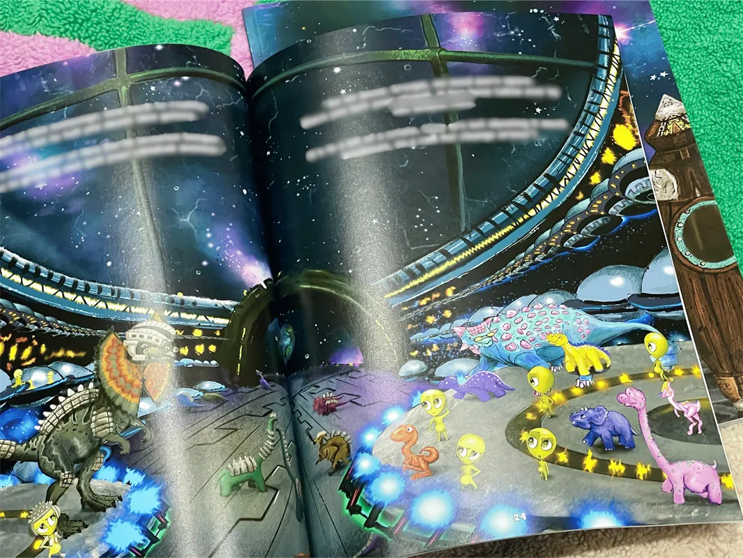 The illustrations are vibrant and full of personality, featuring dinosaurs and aliens, lunar landscapes, friendship, space travel, and Earth invasion themes. Packed with humor, action, and heart, this story blends sci-fi and prehistoric fun, making it perfect for readers who love imaginative worlds, unlikely heroes, and adventurous storytelling.Ideal for fans of dinosaurs, outer space, and stories that celebrate friendship, clever problem-solving, and a little bit of chaos—this is a journey from Earth to the moon and back again, with plenty of surprises along the way. 🚀🦖👽