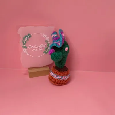 Hand made crochet cactus in sombrero with maracas, join them for a party