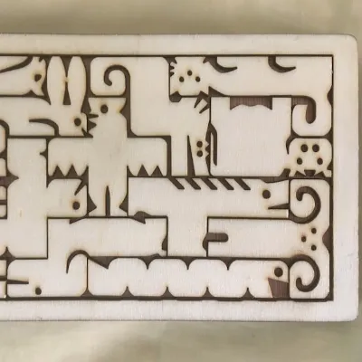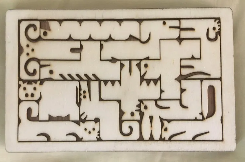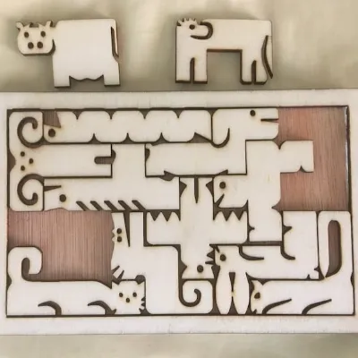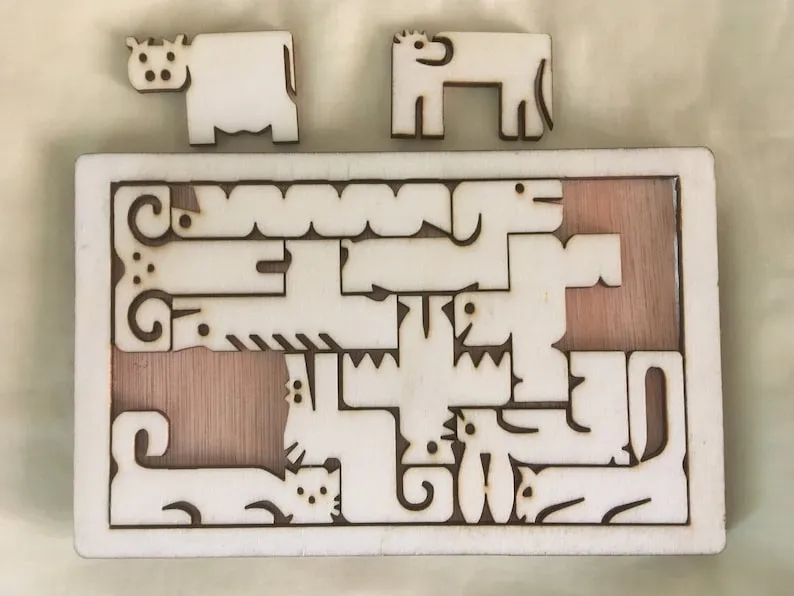 The puzzle pieces are cut from 3mm (1/8") Poplar Plywood and the Puzzle is backed with 3mm (1/8") Birch or Eucalyptus Plywood and it is finished with a coat of Boiled Linseed Oil.
