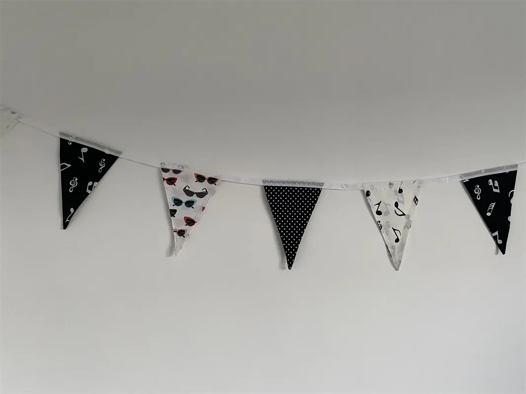 Handmade cotton bunting. This is a 50’s music inspired bunting. There are 8 double sided flags which are sewn onto a white binding. The length measures approximately 2 metres