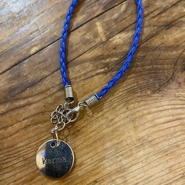 This is a handmade twisted blue cord bracelet with a Karma charm.