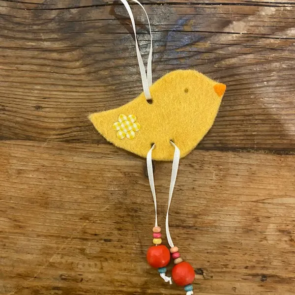 This handmade acrylic felt bird measures about 5cm long, 3cm high, and 0.5cm wide. It’s yellow with a matching yellow flower and hangs from a white ribbon, making it a charming decoration for an Easter tree.