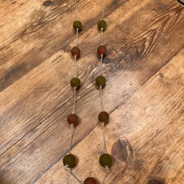 Handcrafted felt necklace in vibrant red and olive green, measuring about 56 cm in length.