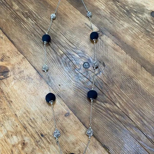 A handmade felt necklace featuring a mix of black felt balls and silver-coloured rose beads, strung on a black cord.