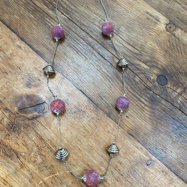 A handmade felt necklace featuring a mix of pink felt balls and silver-coloured beads, strung on a chain.