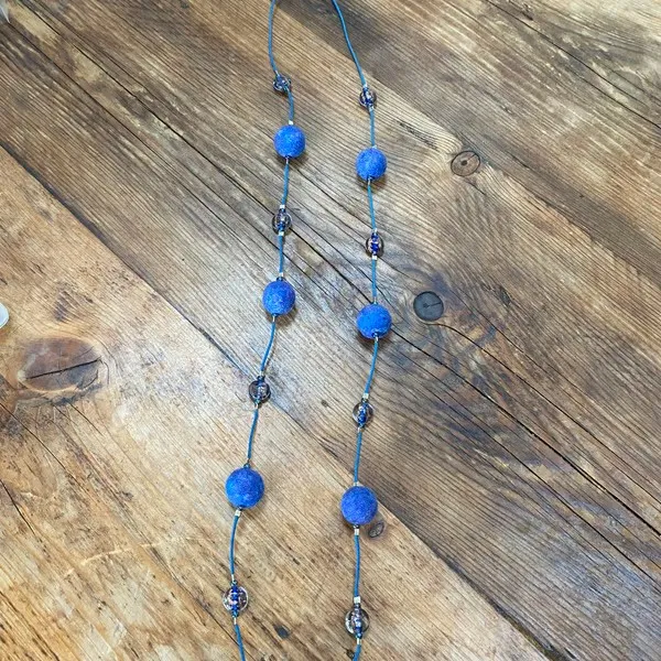A handmade felt necklace featuring a mix of blue felt balls and large clear beads strung on a blue cord.