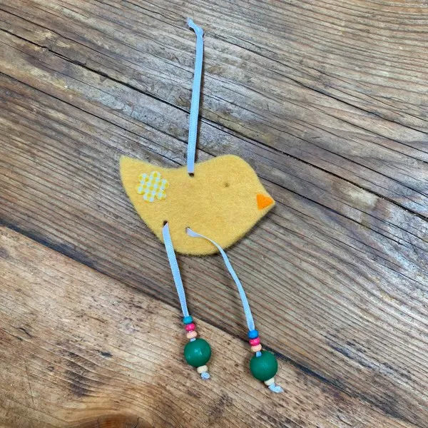 This handmade acrylic felt bird measures about 5 cm long, 3 cm wide, and 1.2 cm thick. It’s a cheerful yellow with a matching yellow flower and hangs from a white ribbon, making it a charming decoration for an Easter tree.
