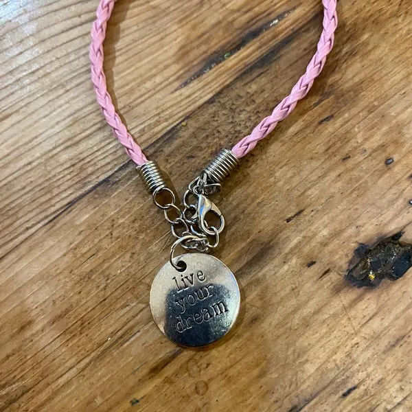 This is a handmade twisted pink cord bracelet with a Live Your Dream Charm.