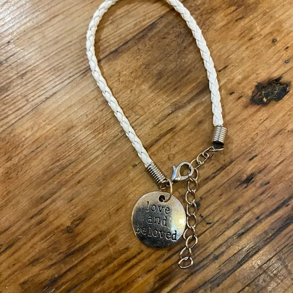 This is a handmade twisted blue white bracelet with a Love and Beloved charm.
