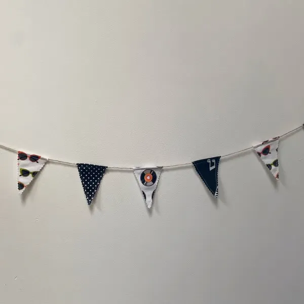 This handmade cotton-blend music mini bunting features 7 flags, each backed with white fabric and stitched onto a jute string. The total length is about 1 metre.