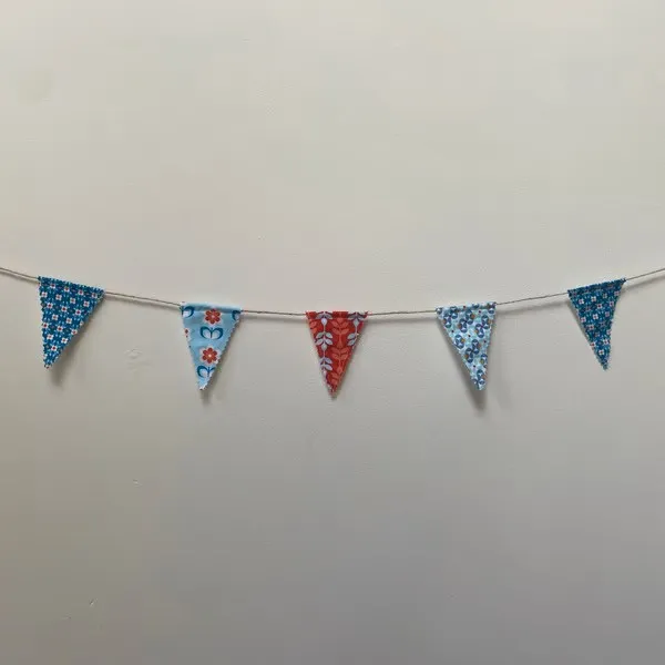 This handmade cotton-blend seventies mini bunting features 7 flags, each backed with white fabric and stitched onto a jute string. The total length is about 1 metre.