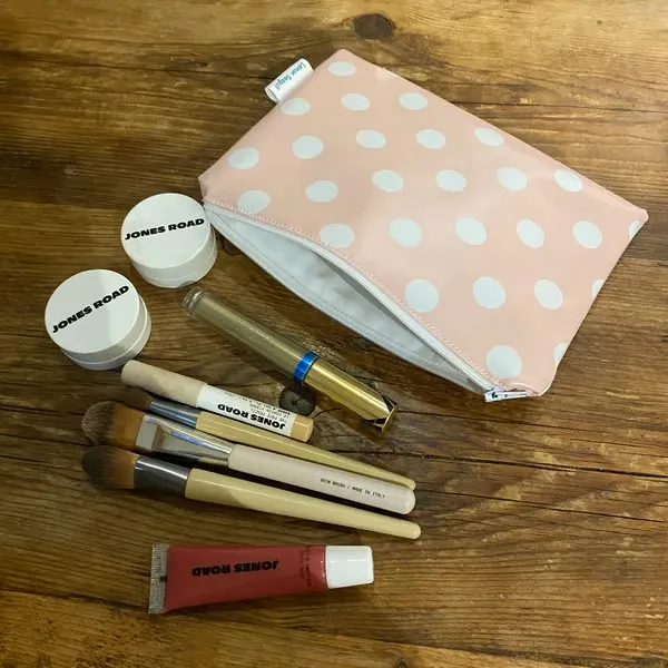 This bag is crafted from pink oilcloth adorned with white spots, lined with soft white cotton fabric, and finished with a white zip. It’s perfect for makeup or toiletries, and ideal for the beach to keep your belongings dry and free from sand. Makeup and brushes not included. Measures 15.5cm x 22cm.