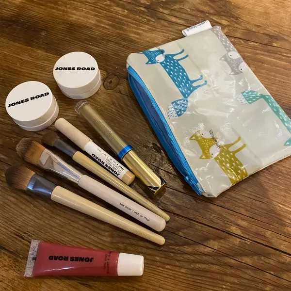 This bag is crafted from grey oilcloth adorned with coloured foxes, lined with soft blue cotton fabric, and finished with a grey zip. It’s perfect for makeup or toiletries, and ideal for the beach to keep your belongings dry and free from sand. Makeup and brushes not included. Measures 15.5cm x 22cm.