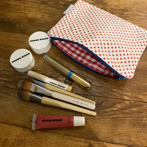 This bag is crafted from white oilcloth adorned with red spots, lined with red gingham cotton fabric, and finished with a blue zip. It’s perfect for makeup or toiletries, and ideal for the beach to keep your belongings dry and free from sand. Makeup and brushes not included. Measures 15.5cm x 22cm.