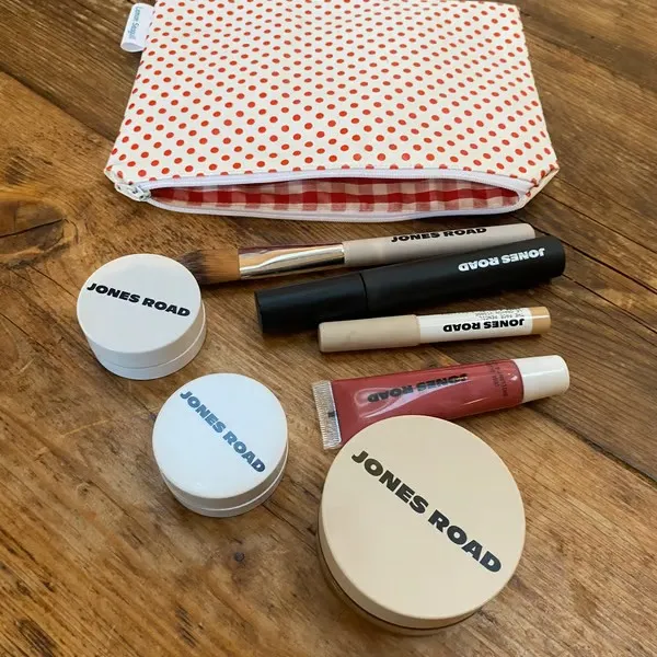 This bag is crafted from white oilcloth adorned with red spots, lined with red gingham cotton fabric, and finished with a white zip. It’s perfect for makeup or toiletries, and ideal for the beach to keep your belongings dry and free from sand. Makeup and brushes not included. Measures 15.5cm x 22cm.