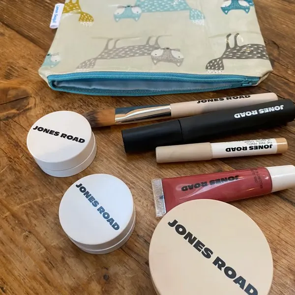 This bag is crafted from grey oilcloth adorned with coloured foxes, lined with soft blue cotton fabric, and finished with a turquoise zip. It’s perfect for makeup or toiletries, and ideal for the beach to keep your belongings dry and free from sand. Makeup and brushes not included. Measures 15.5cm x 22cm.