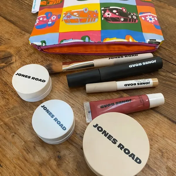 This bag is crafted from multicoloured oilcloth adorned with hippy fun vehicle designs, lined with orange cotton fabric, and finished with a purple zip. It’s perfect for makeup or toiletries, and ideal for the beach to keep your belongings dry and free from sand. Makeup and brushes not included. Measures 15.5cm x 22cm.