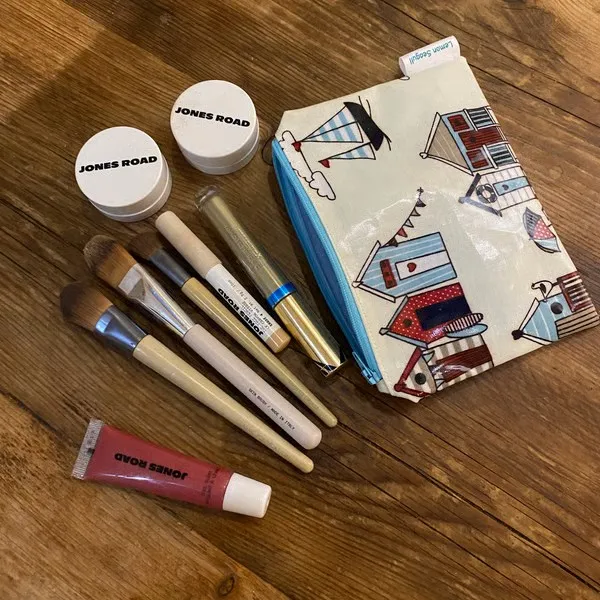 This makeup bag is crafted from cream oilcloth with charming seaside designs. It’s lined with a blue cotton fabric and finished with a blue zip. Makeup and brushes are not included. Measures 12.5cm x 17cm.
