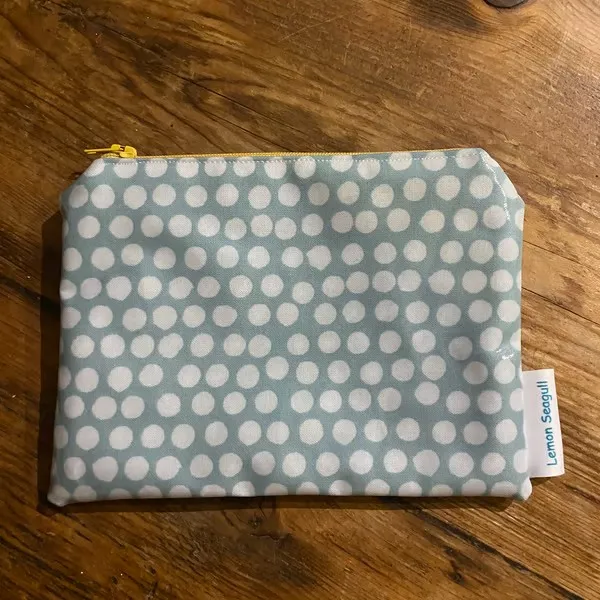 This makeup bag is crafted from grey/green oilcloth with charming spots. It’s lined with green and white striped cotton fabric and finished with a yellow zip. Makeup and brushes are not included. Measures 12.5cm x 17cm.