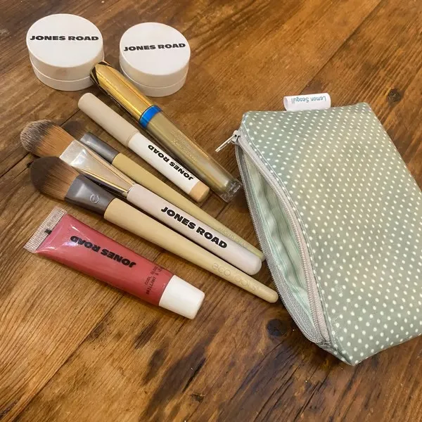 This makeup bag is crafted from sage green oilcloth with charming white spots. It’s lined with green and white striped cotton fabric and finished with a grey zip. Makeup and brushes are not included. Measures 12.5cm x 17cm.