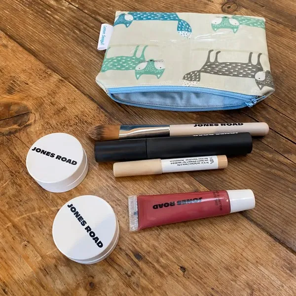 This makeup bag is crafted from grey oilcloth with coloured foxes. It’s lined with pale blue cotton fabric and finished with a pale blue zip. Makeup and brushes are not included. Measures 12.5cm x 17cm.