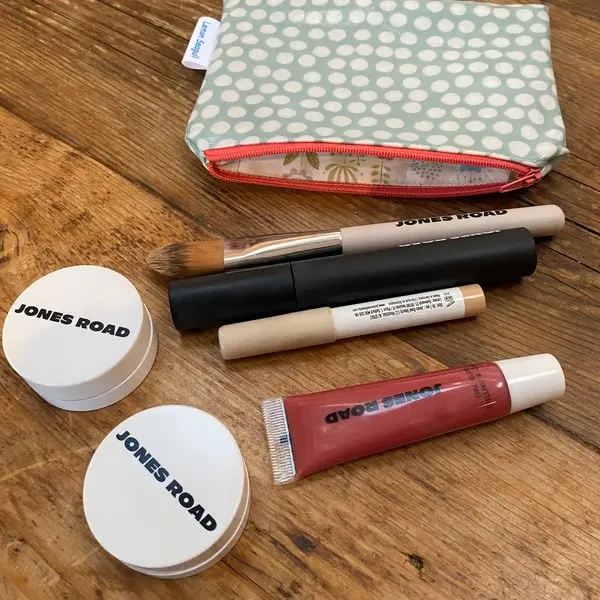 This makeup bag is crafted from grey/green oilcloth with charming spots. It’s lined with a floral pattern cotton fabric and finished with a pink zip. Makeup and brushes are not included. Measures 12.5cm x 17cm.