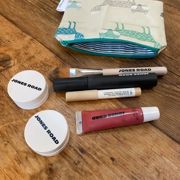 This makeup bag is crafted from grey oilcloth with coloured foxes. It’s lined with teal and white striped cotton fabric and finished with a green zip. Makeup and brushes are not included. Measures 12.5cm x 17cm.