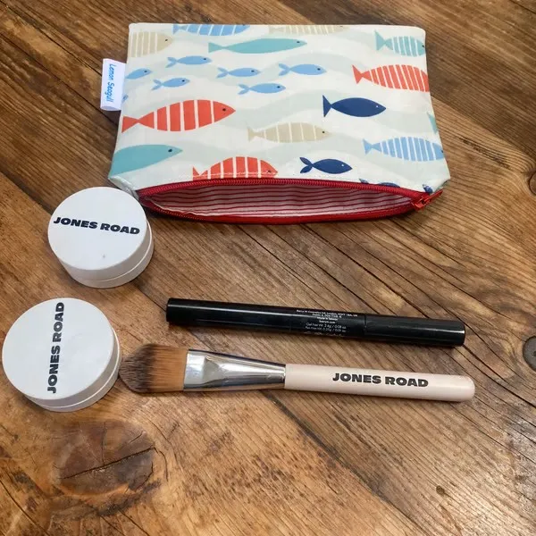 This makeup bag is crafted from blue patterned oilcloth with charming coloured fish. It’s lined with red and white striped cotton fabric and finished with a red zip. Makeup and brushes are not included. Measures 12.5cm x 17cm.
