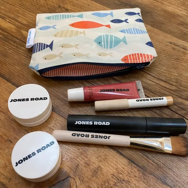 This makeup bag is crafted from blue patterned oilcloth with charming coloured fish. It’s lined with red and white striped cotton fabric and finished with a blue zip. Makeup and brushes are not included. Measures 12.5cm x 17cm.