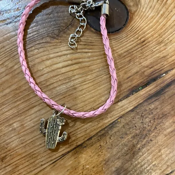 This is a handmade twisted pink cord bracelet with a Cactus charm.