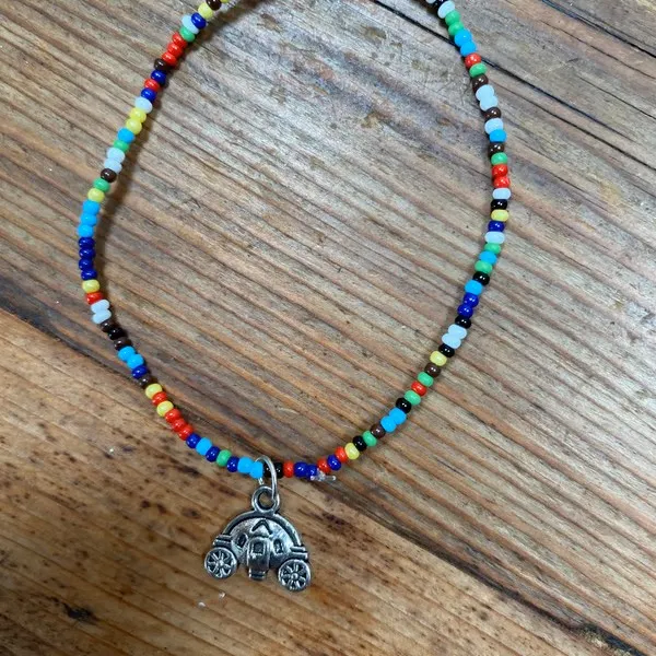 Handmade fun rainbow bracelet with a silver coloured Baby Carriage charm.