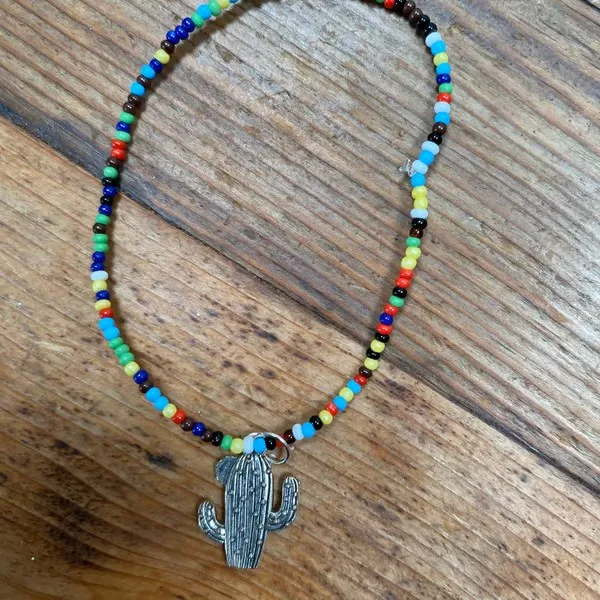 Handmade fun rainbow bracelet with a silver coloured Cactus charm.