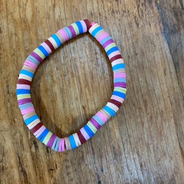 This is a handmade bracelet with multicoloured beads threaded on elastic.