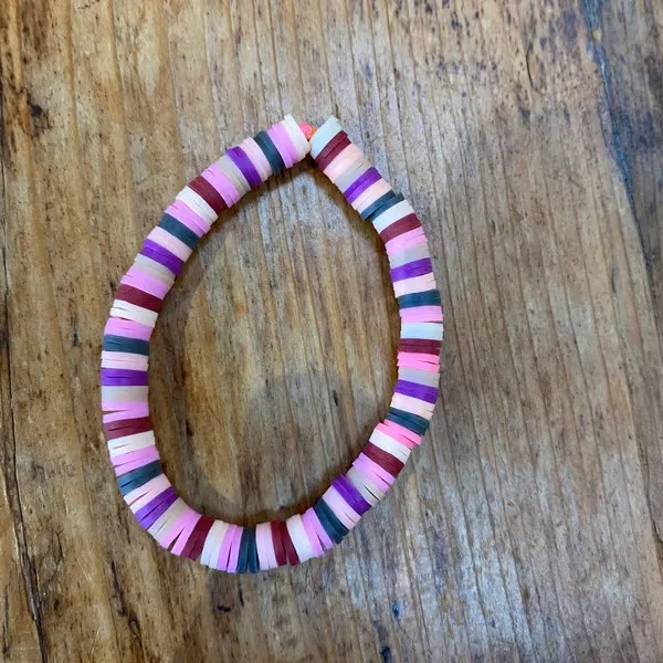 This is a handmade bracelet with multicoloured beads threaded on elastic.