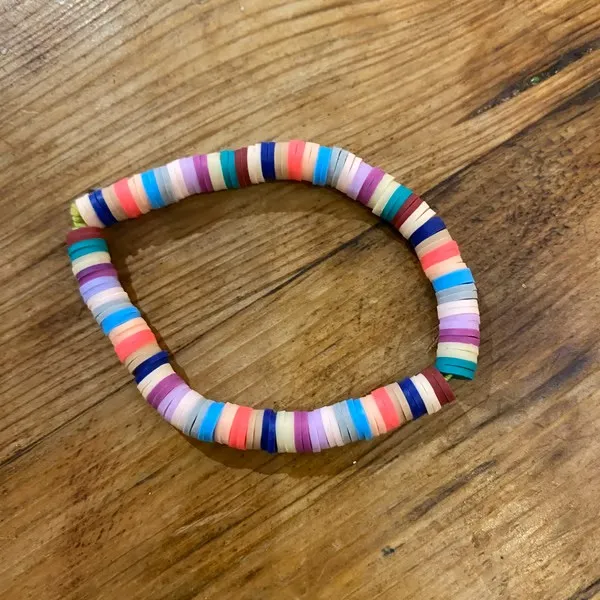 This handmade stretchy bracelet features a mix of colourful beads.