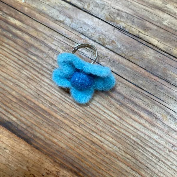 This handmade needle-felted children's ring features a playful turquoise flower on an adjustable band.