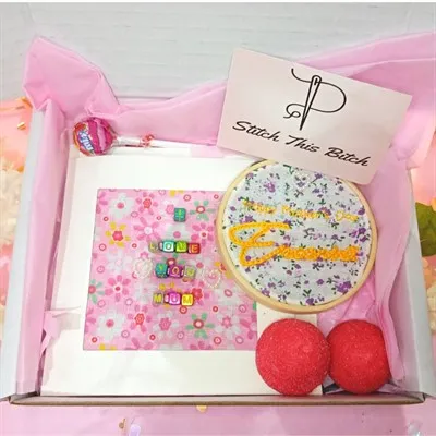 Personalised Mothers day boxes includes a personalised hoop, card and added sweet treats