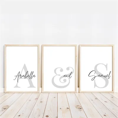 A great set of prints featuring bold initials in grey and overlaid with names in script. A fab option for hanging above the bed!